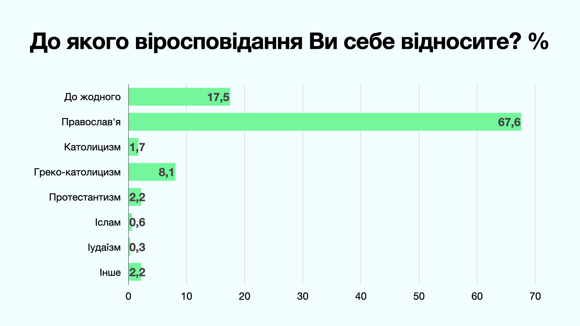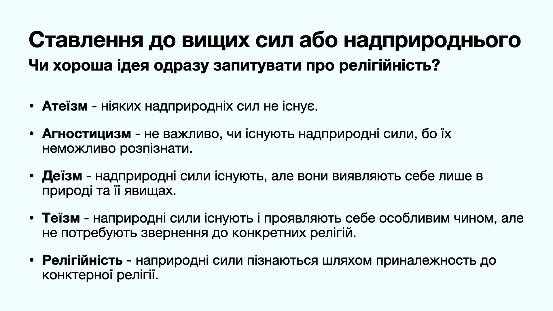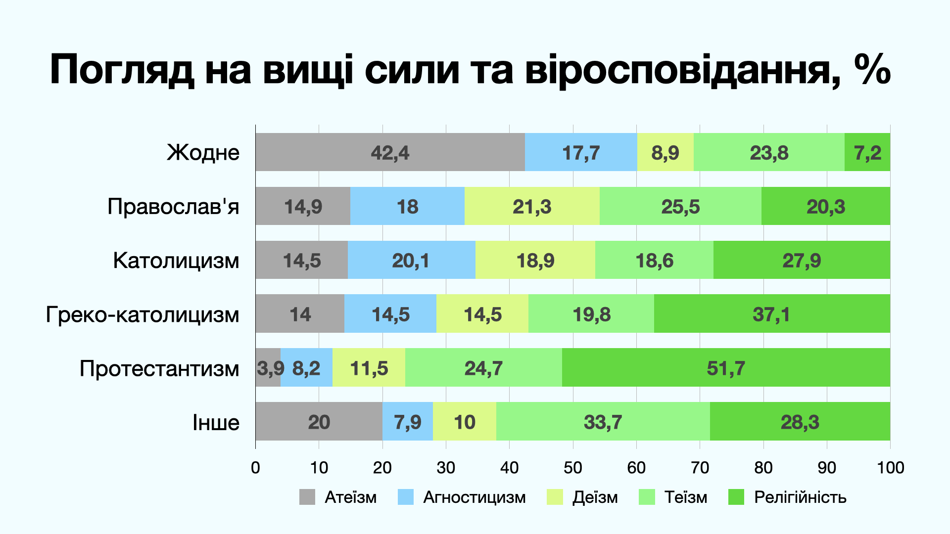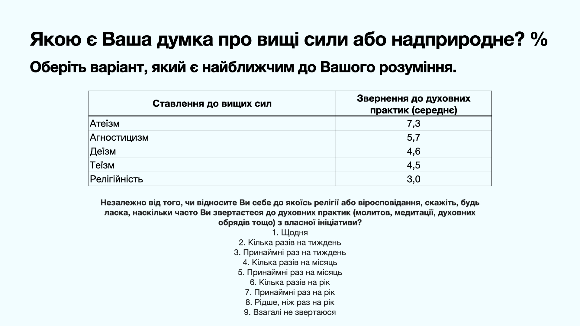 Аналізуючи ставлення до вищих сил або надприродного, автор виділяє 5 точок зору (позицій): атеїзм, агностицизм, деїзм, теїзм, релігійність. Відповіді на питання: «Якою є ваша думка про вищі сили або надприродне?» автор розбив на 5 варіантів. Найбільше голосів (24.7) набрав варіант «Вищі сили існують, діють надприродним чином, але насправді не пов’язані з релігіями».