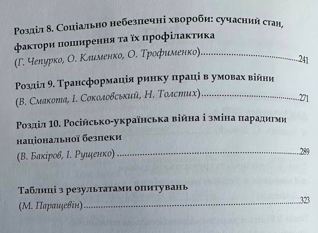Провідні вчені ІС НАН України – Євгеній Головаха, Сергій Дембіцький, Сергій Макеєв, Володимир Резнік, Наталія Костенко, Олена Здобіна, Олександр Стегній, Гульбаршин Чепурко та ряд інших, включно з Президентом Соціологічної Асоціації України академіком Вілем Бакіровим в десяти розділах детально проаналізували соціальні і психологічні аспекти суспільних станів та процесів вітчизняного суспільства за останні два роки виснажливої і психотравмуючої агресивної війни РФ проти України.